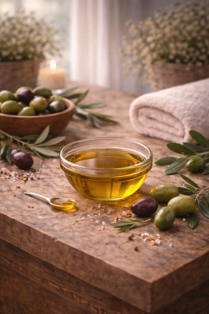 - Skyddar hud och hår: Olivolja har fuktgivande och närande egenskaper för huden och håret. Den kan användas som en naturlig fuktighetskräm, massageolja eller hårmask för att förbättra hudens hälsa och glansigt hår.